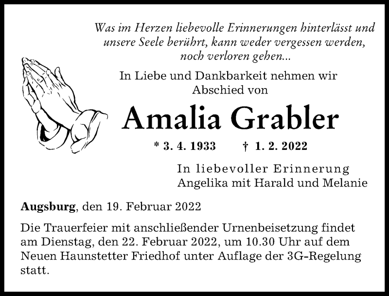Hier finden Sie alle Traueranzeigen aus der Zeitung, die bisher für Amalia Grabler erschienen sind. Weitere Traueranzeigen, die in der Zeitung erscheinen, werden hier ebenfalls aufgelistet