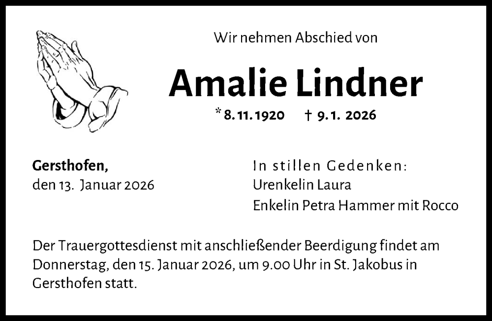 Hier finden Sie alle Traueranzeigen aus der Zeitung, die bisher für Amalie Lindner erschienen sind. Weitere Traueranzeigen, die in der Zeitung erscheinen, werden hier ebenfalls aufgelistet