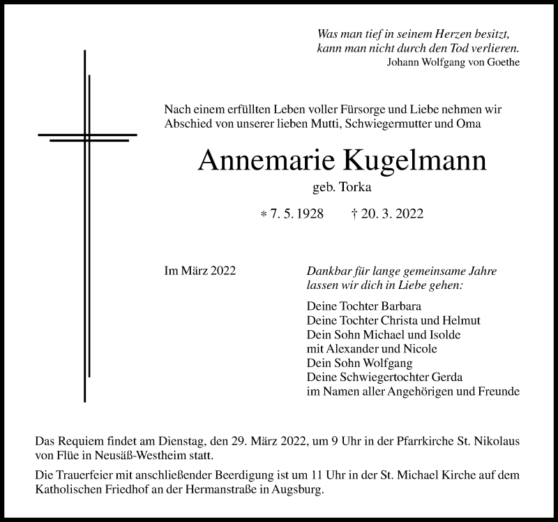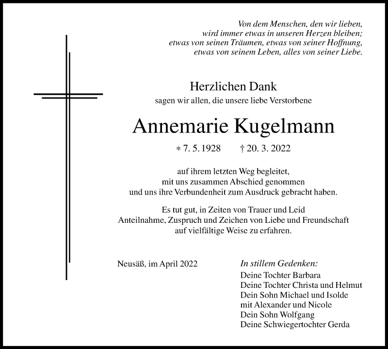 Hier finden Sie alle Traueranzeigen aus der Zeitung, die bisher für Annemarie Kugelmann erschienen sind. Weitere Traueranzeigen, die in der Zeitung erscheinen, werden hier ebenfalls aufgelistet