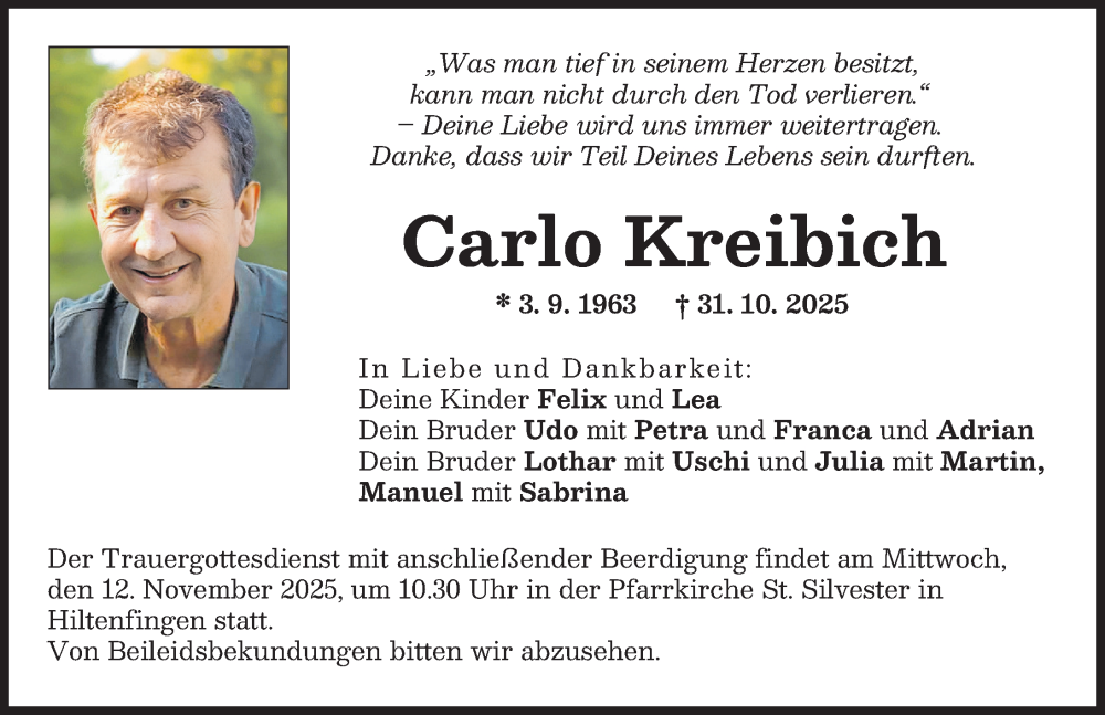Hier finden Sie alle Traueranzeigen aus der Zeitung, die bisher für Carlo Kreibich erschienen sind. Weitere Traueranzeigen, die in der Zeitung erscheinen, werden hier ebenfalls aufgelistet