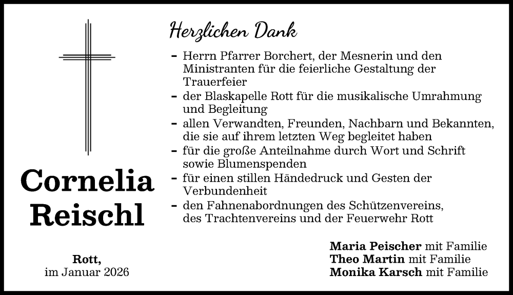 Hier finden Sie alle Traueranzeigen aus der Zeitung, die bisher für Cornelia Reischl erschienen sind. Weitere Traueranzeigen, die in der Zeitung erscheinen, werden hier ebenfalls aufgelistet