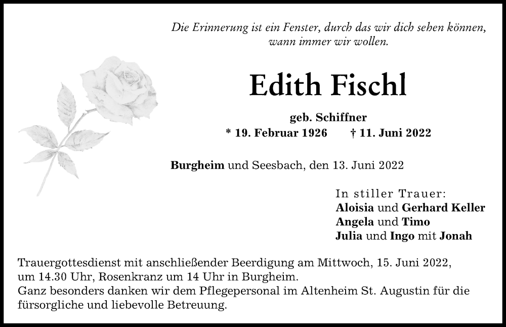 Hier finden Sie alle Traueranzeigen aus der Zeitung, die bisher für Edith Fischl erschienen sind. Weitere Traueranzeigen, die in der Zeitung erscheinen, werden hier ebenfalls aufgelistet