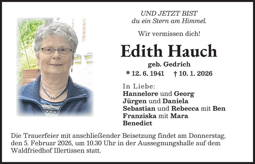 Hier finden Sie alle Traueranzeigen aus der Zeitung, die bisher für Edith Hauch erschienen sind. Weitere Traueranzeigen, die in der Zeitung erscheinen, werden hier ebenfalls aufgelistet