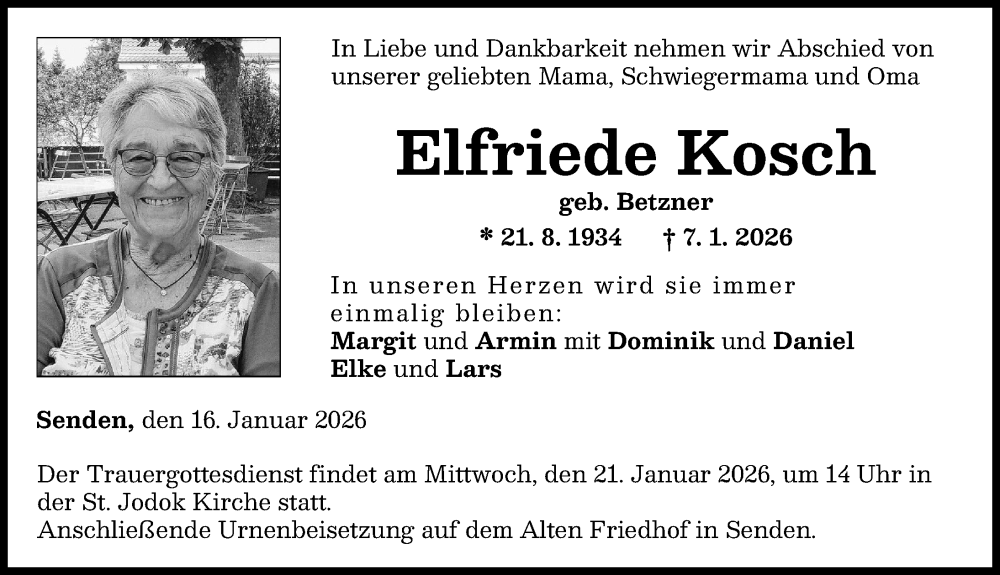 Hier finden Sie alle Traueranzeigen aus der Zeitung, die bisher für Elfriede Kosch erschienen sind. Weitere Traueranzeigen, die in der Zeitung erscheinen, werden hier ebenfalls aufgelistet