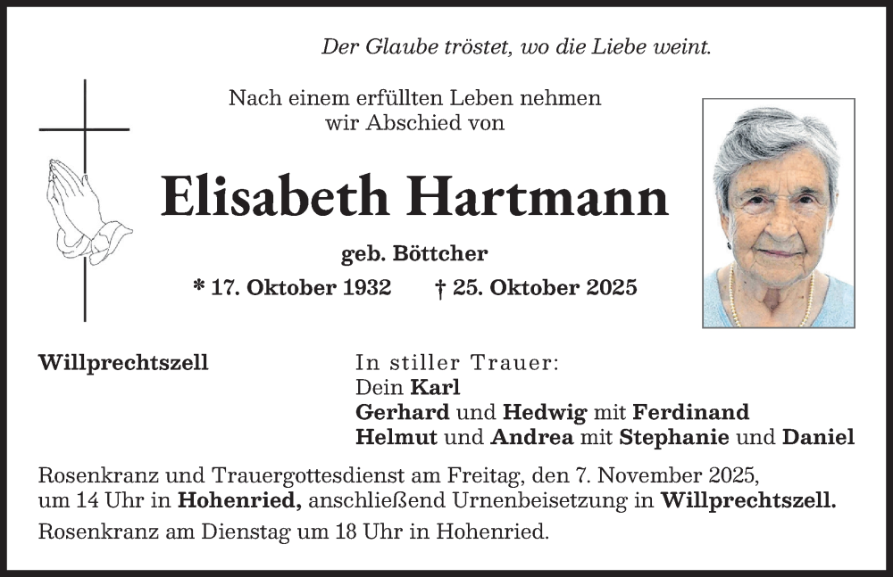 Hier finden Sie alle Traueranzeigen aus der Zeitung, die bisher für Elisabeth Hartmann erschienen sind. Weitere Traueranzeigen, die in der Zeitung erscheinen, werden hier ebenfalls aufgelistet