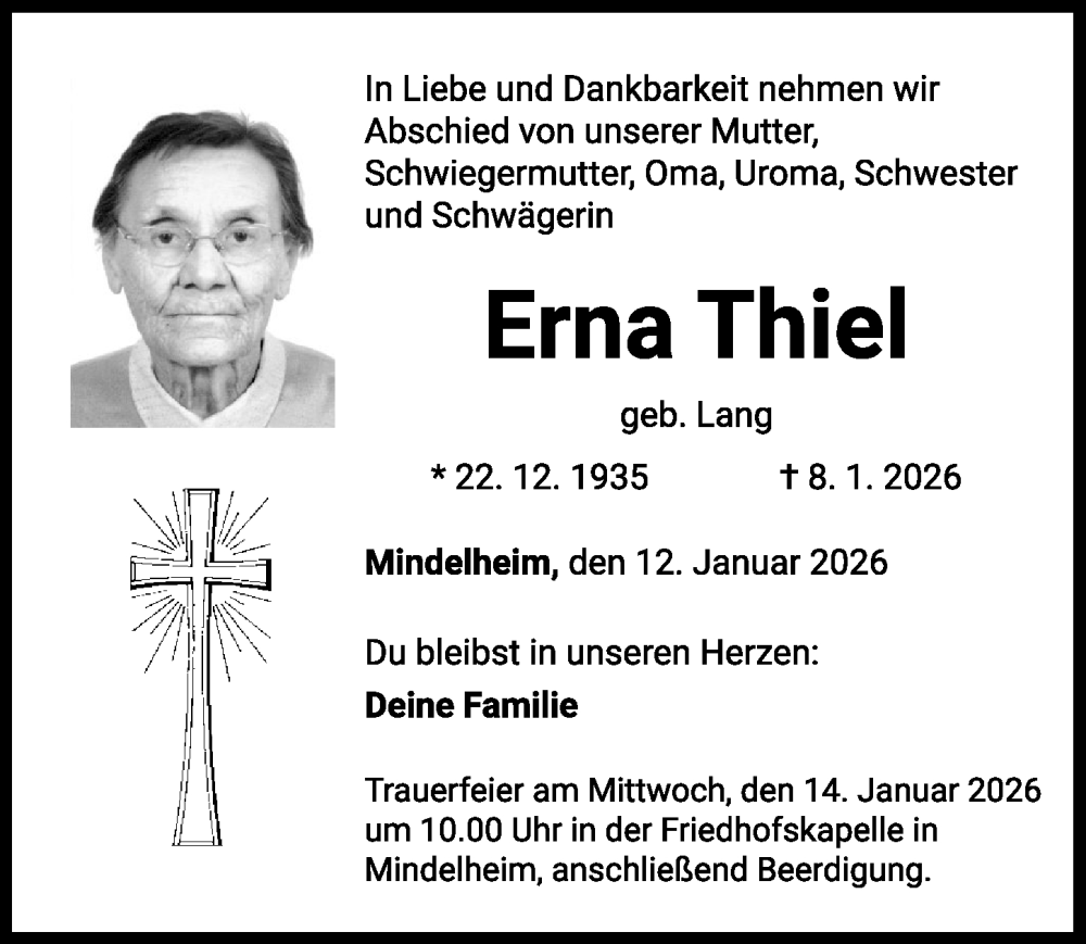 Hier finden Sie alle Traueranzeigen aus der Zeitung, die bisher für Erna Thiel erschienen sind. Weitere Traueranzeigen, die in der Zeitung erscheinen, werden hier ebenfalls aufgelistet