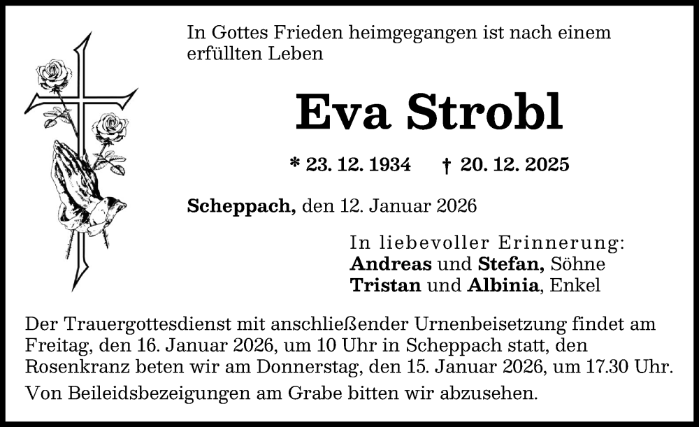 Hier finden Sie alle Traueranzeigen aus der Zeitung, die bisher für Eva Strobl erschienen sind. Weitere Traueranzeigen, die in der Zeitung erscheinen, werden hier ebenfalls aufgelistet