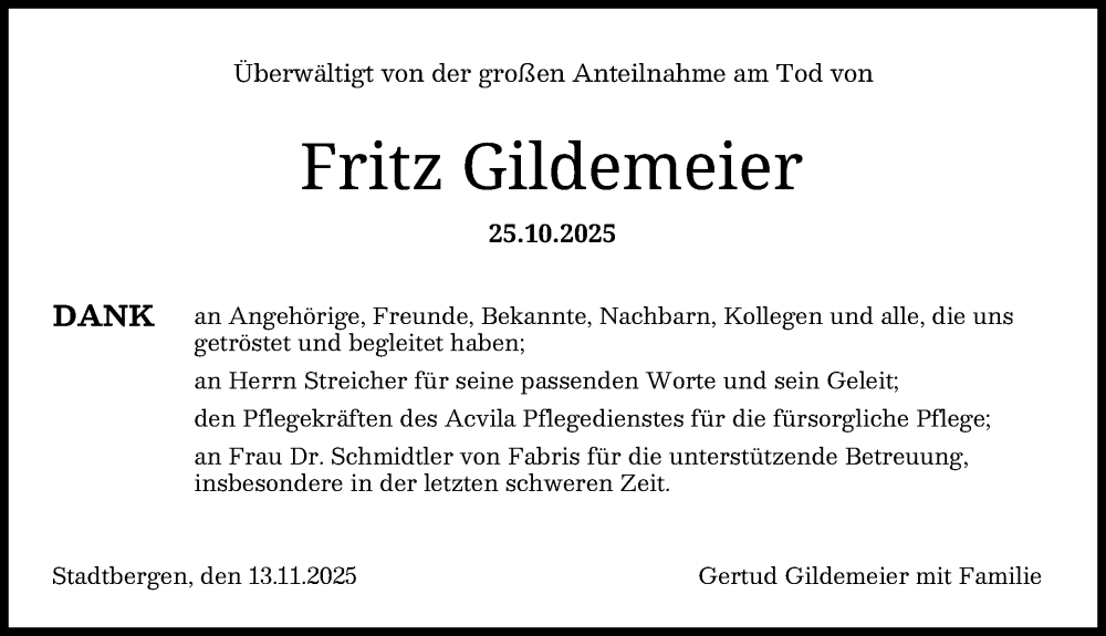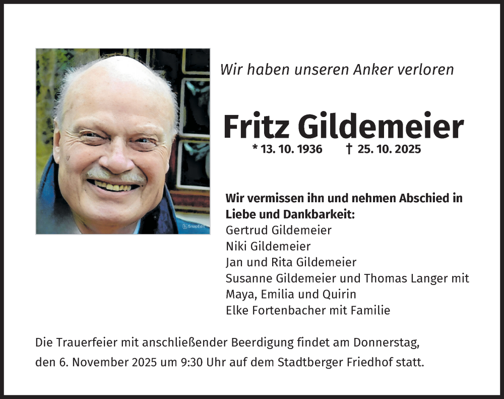 Hier finden Sie alle Traueranzeigen aus der Zeitung, die bisher für Fritz Gildemeier erschienen sind. Weitere Traueranzeigen, die in der Zeitung erscheinen, werden hier ebenfalls aufgelistet