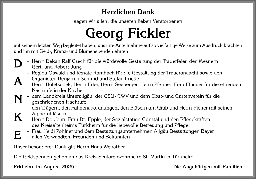Hier finden Sie alle Traueranzeigen aus der Zeitung, die bisher für Georg Fickler erschienen sind. Weitere Traueranzeigen, die in der Zeitung erscheinen, werden hier ebenfalls aufgelistet