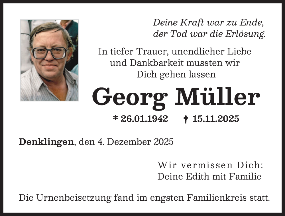 Hier finden Sie alle Traueranzeigen aus der Zeitung, die bisher für Georg Müller erschienen sind. Weitere Traueranzeigen, die in der Zeitung erscheinen, werden hier ebenfalls aufgelistet