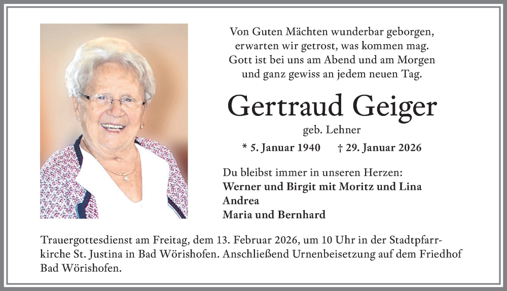 Hier finden Sie alle Traueranzeigen aus der Zeitung, die bisher für Gertraud Geiger erschienen sind. Weitere Traueranzeigen, die in der Zeitung erscheinen, werden hier ebenfalls aufgelistet