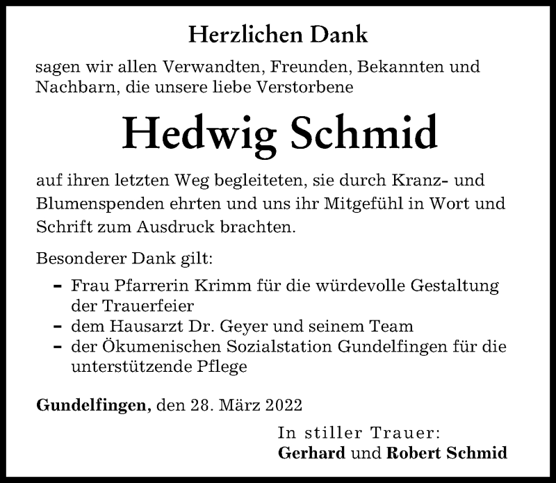 Hier finden Sie alle Traueranzeigen aus der Zeitung, die bisher für Hedwig Schmid erschienen sind. Weitere Traueranzeigen, die in der Zeitung erscheinen, werden hier ebenfalls aufgelistet