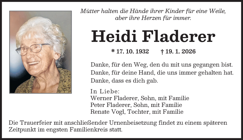 Hier finden Sie alle Traueranzeigen aus der Zeitung, die bisher für Heidi Fladerer erschienen sind. Weitere Traueranzeigen, die in der Zeitung erscheinen, werden hier ebenfalls aufgelistet