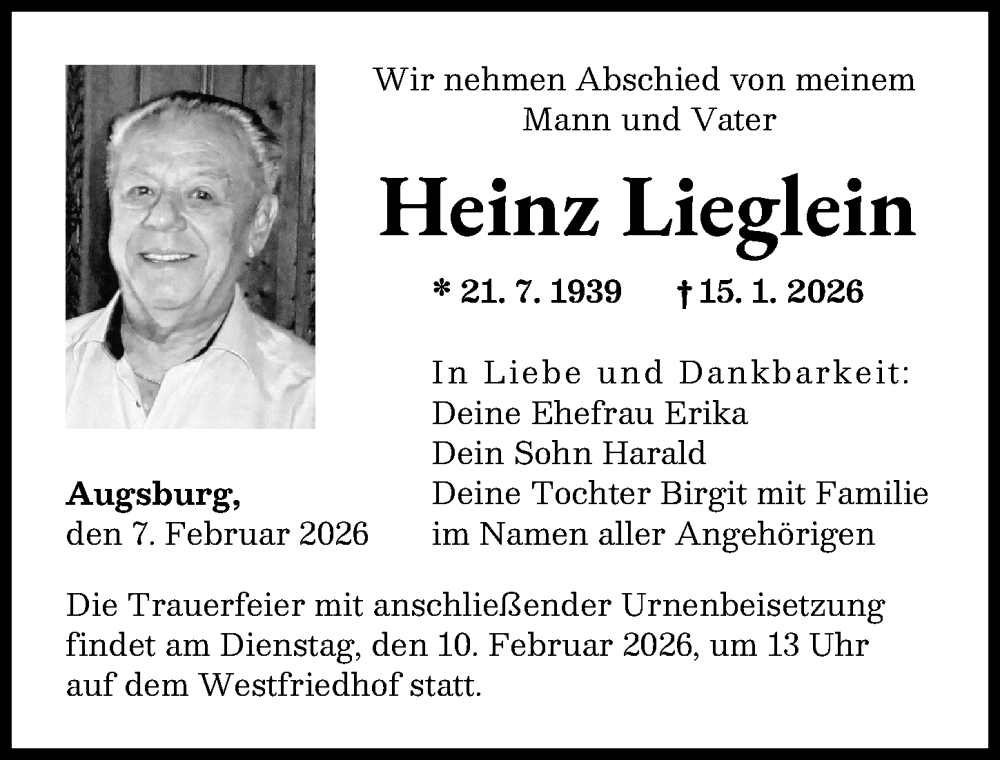 Hier finden Sie alle Traueranzeigen aus der Zeitung, die bisher für Heinz Lieglein erschienen sind. Weitere Traueranzeigen, die in der Zeitung erscheinen, werden hier ebenfalls aufgelistet