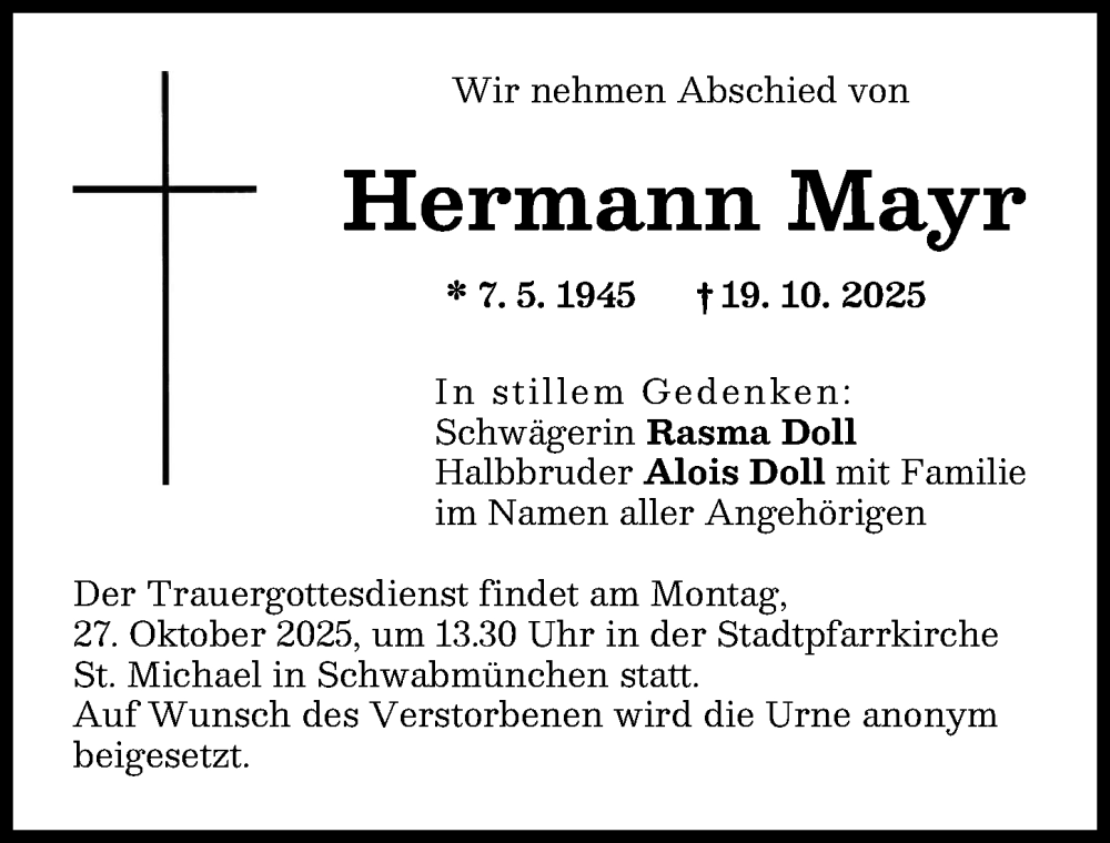 Hier finden Sie alle Traueranzeigen aus der Zeitung, die bisher für Hermann Mayr erschienen sind. Weitere Traueranzeigen, die in der Zeitung erscheinen, werden hier ebenfalls aufgelistet