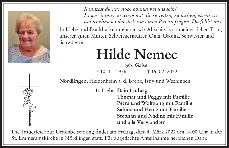 Hier finden Sie alle Traueranzeigen aus der Zeitung, die bisher für Hilde Nemec erschienen sind. Weitere Traueranzeigen, die in der Zeitung erscheinen, werden hier ebenfalls aufgelistet
