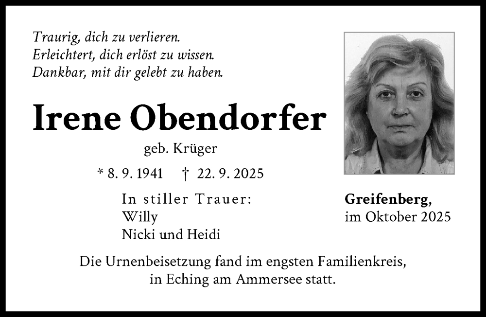 Hier finden Sie alle Traueranzeigen aus der Zeitung, die bisher für Irene Obendorfer erschienen sind. Weitere Traueranzeigen, die in der Zeitung erscheinen, werden hier ebenfalls aufgelistet