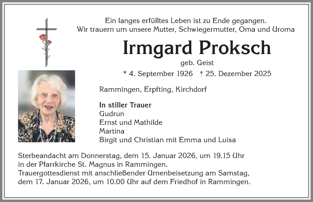 Hier finden Sie alle Traueranzeigen aus der Zeitung, die bisher für Irmgard Proksch erschienen sind. Weitere Traueranzeigen, die in der Zeitung erscheinen, werden hier ebenfalls aufgelistet