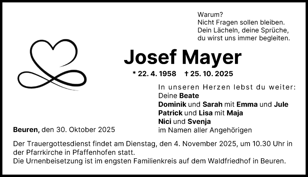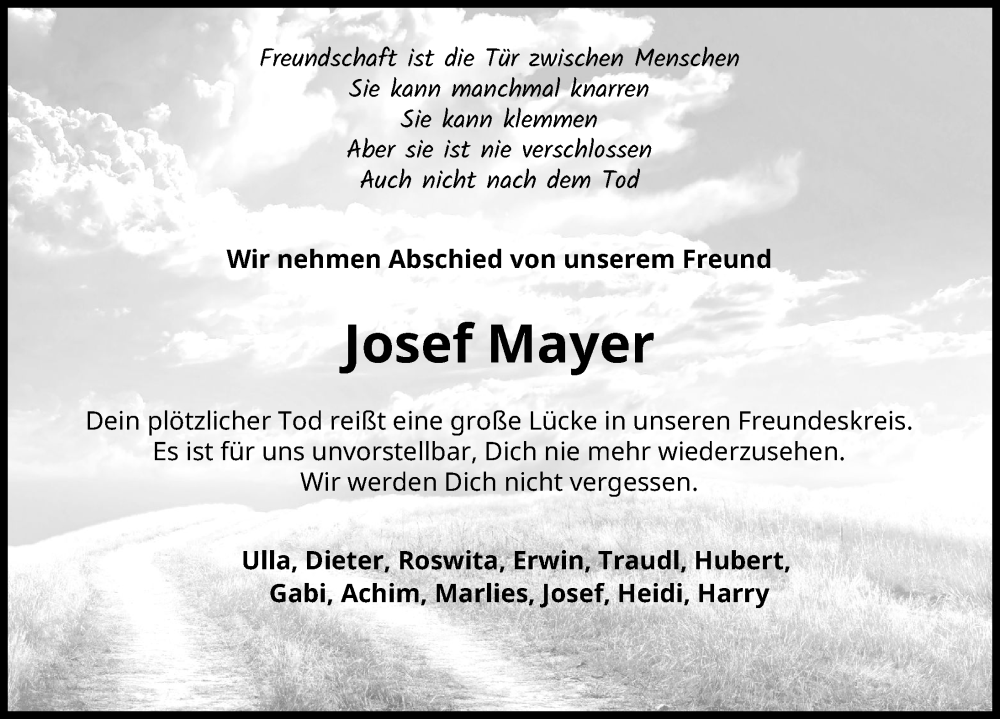 Hier finden Sie alle Traueranzeigen aus der Zeitung, die bisher für Josef Mayer erschienen sind. Weitere Traueranzeigen, die in der Zeitung erscheinen, werden hier ebenfalls aufgelistet
