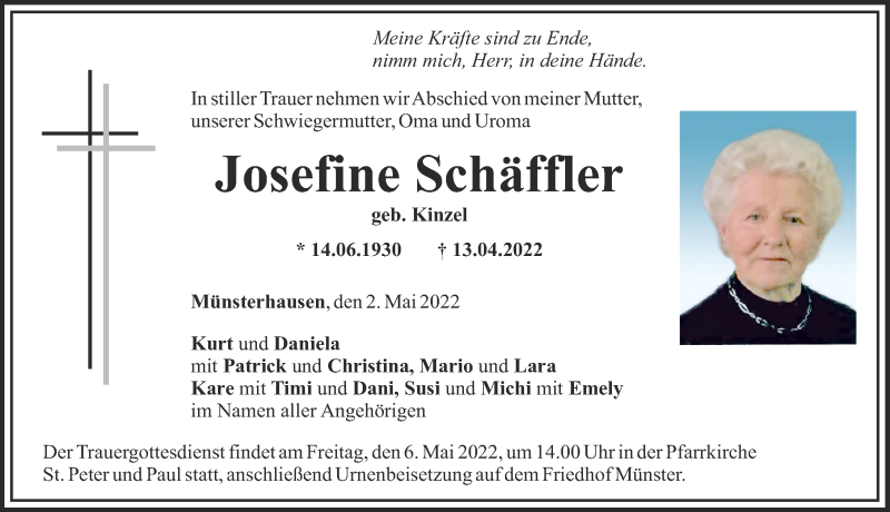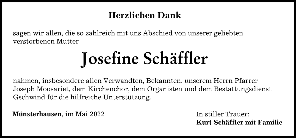 Hier finden Sie alle Traueranzeigen aus der Zeitung, die bisher für Josefine Schäffler erschienen sind. Weitere Traueranzeigen, die in der Zeitung erscheinen, werden hier ebenfalls aufgelistet