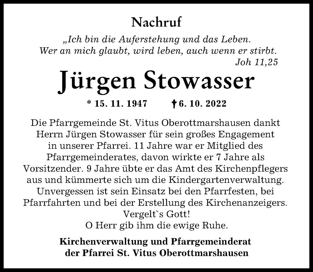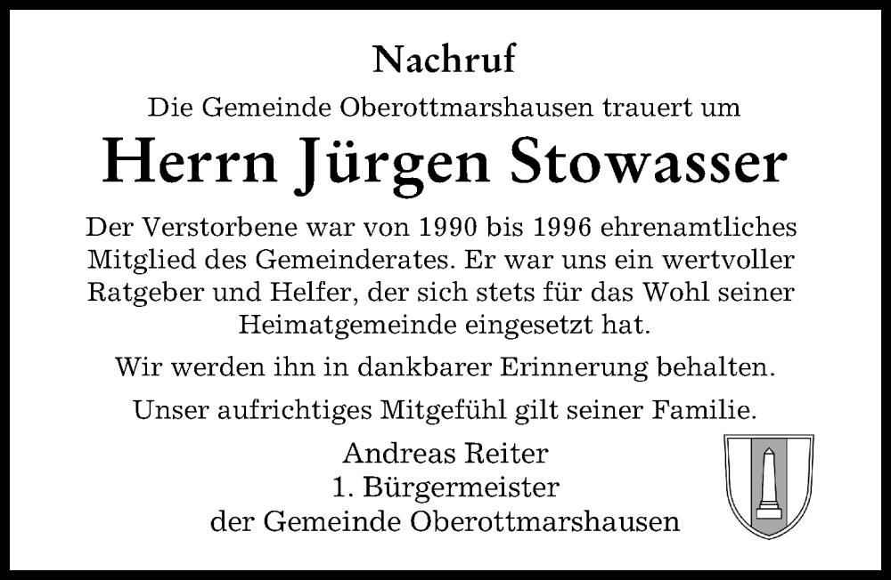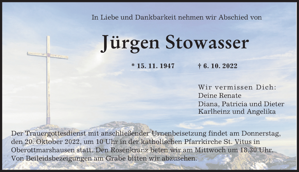 Hier finden Sie alle Traueranzeigen aus der Zeitung, die bisher für Jürgen Stowasser erschienen sind. Weitere Traueranzeigen, die in der Zeitung erscheinen, werden hier ebenfalls aufgelistet