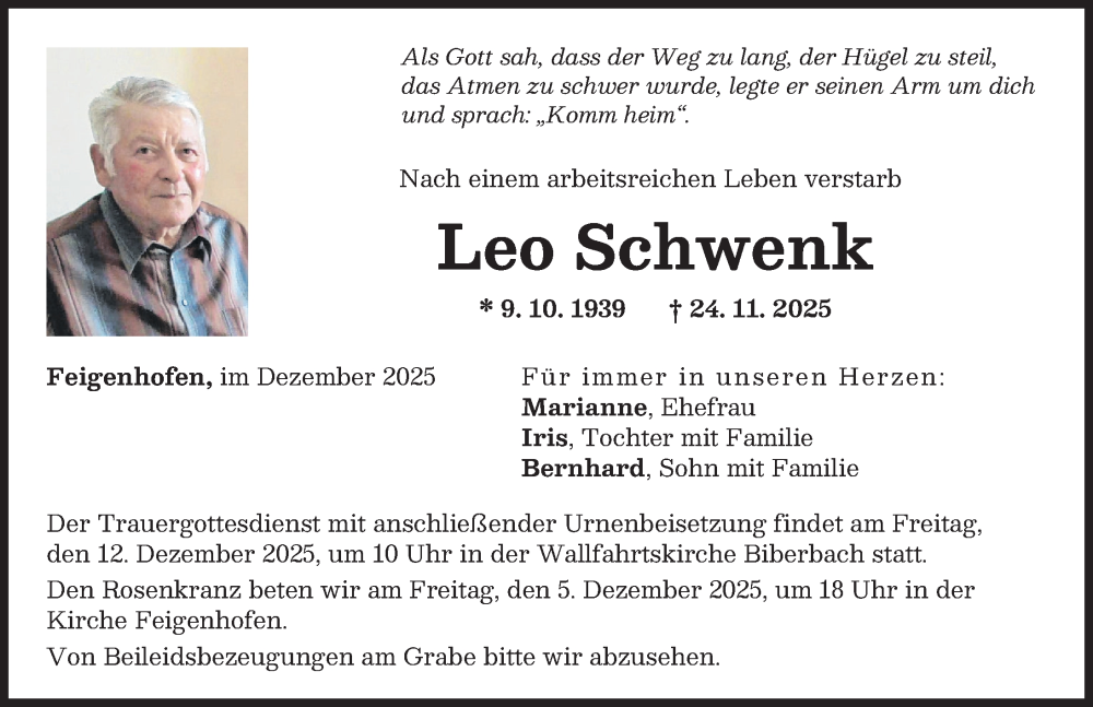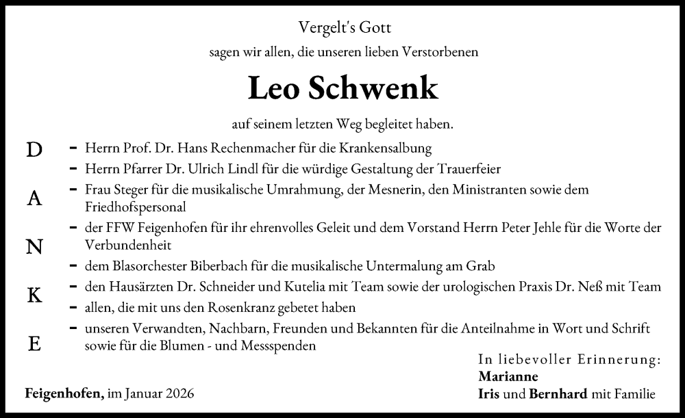 Hier finden Sie alle Traueranzeigen aus der Zeitung, die bisher für Leo Schwenk erschienen sind. Weitere Traueranzeigen, die in der Zeitung erscheinen, werden hier ebenfalls aufgelistet