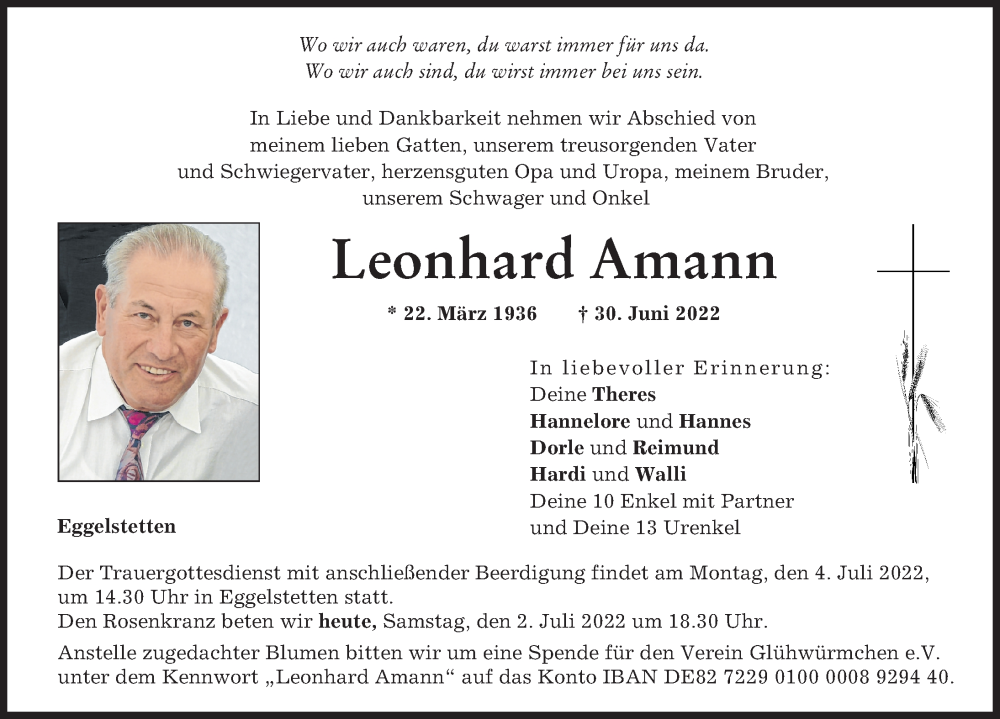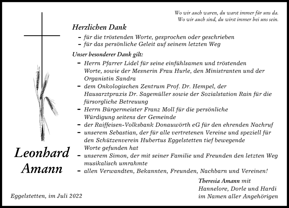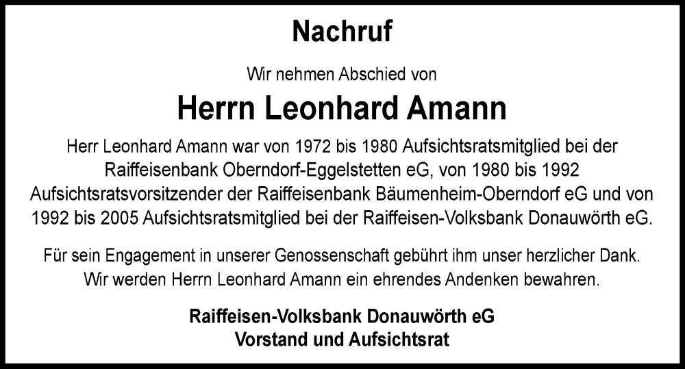 Hier finden Sie alle Traueranzeigen aus der Zeitung, die bisher für Leonhard Amann erschienen sind. Weitere Traueranzeigen, die in der Zeitung erscheinen, werden hier ebenfalls aufgelistet