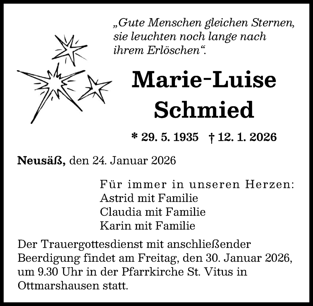 Hier finden Sie alle Traueranzeigen aus der Zeitung, die bisher für Marie-Luise Schmied erschienen sind. Weitere Traueranzeigen, die in der Zeitung erscheinen, werden hier ebenfalls aufgelistet