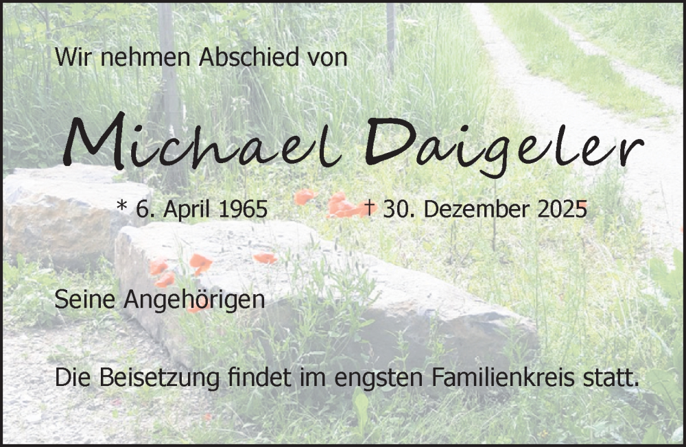 Hier finden Sie alle Traueranzeigen aus der Zeitung, die bisher für Michael Daigeler erschienen sind. Weitere Traueranzeigen, die in der Zeitung erscheinen, werden hier ebenfalls aufgelistet