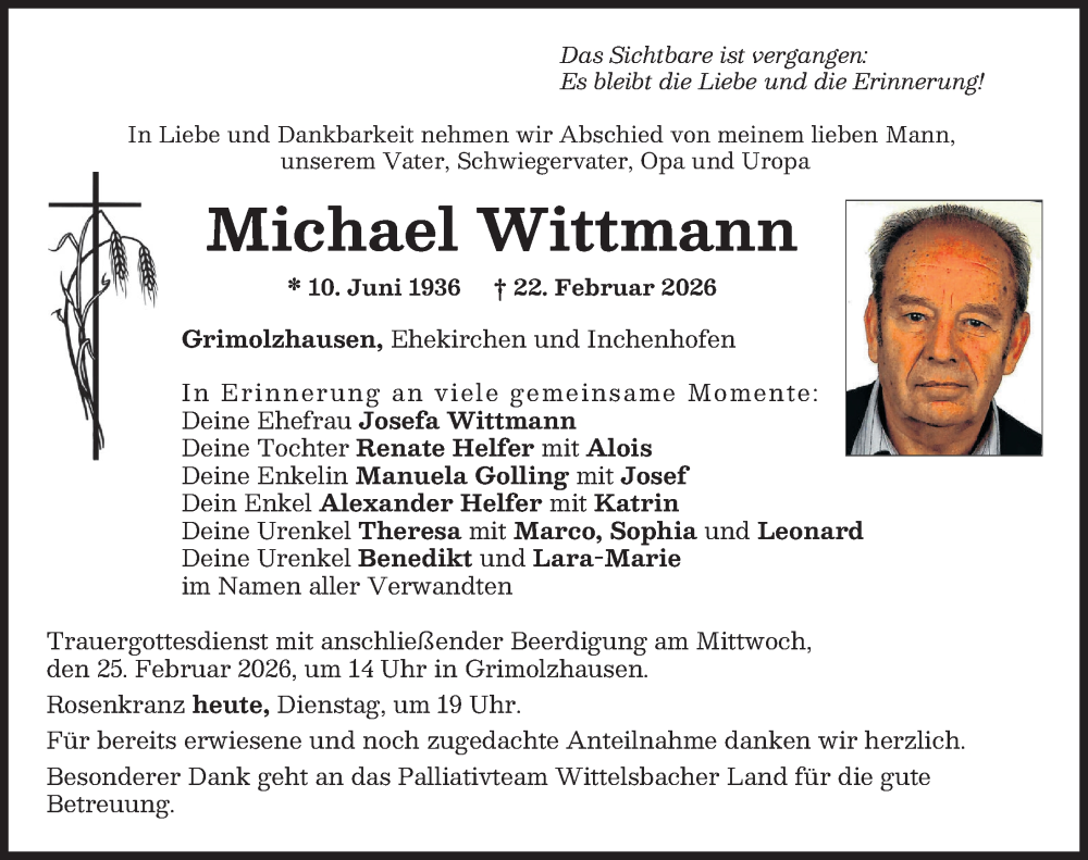 Hier finden Sie alle Traueranzeigen aus der Zeitung, die bisher für Michael Wittmann erschienen sind. Weitere Traueranzeigen, die in der Zeitung erscheinen, werden hier ebenfalls aufgelistet