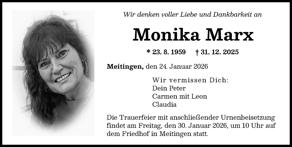 Hier finden Sie alle Traueranzeigen aus der Zeitung, die bisher für Monika Marx erschienen sind. Weitere Traueranzeigen, die in der Zeitung erscheinen, werden hier ebenfalls aufgelistet