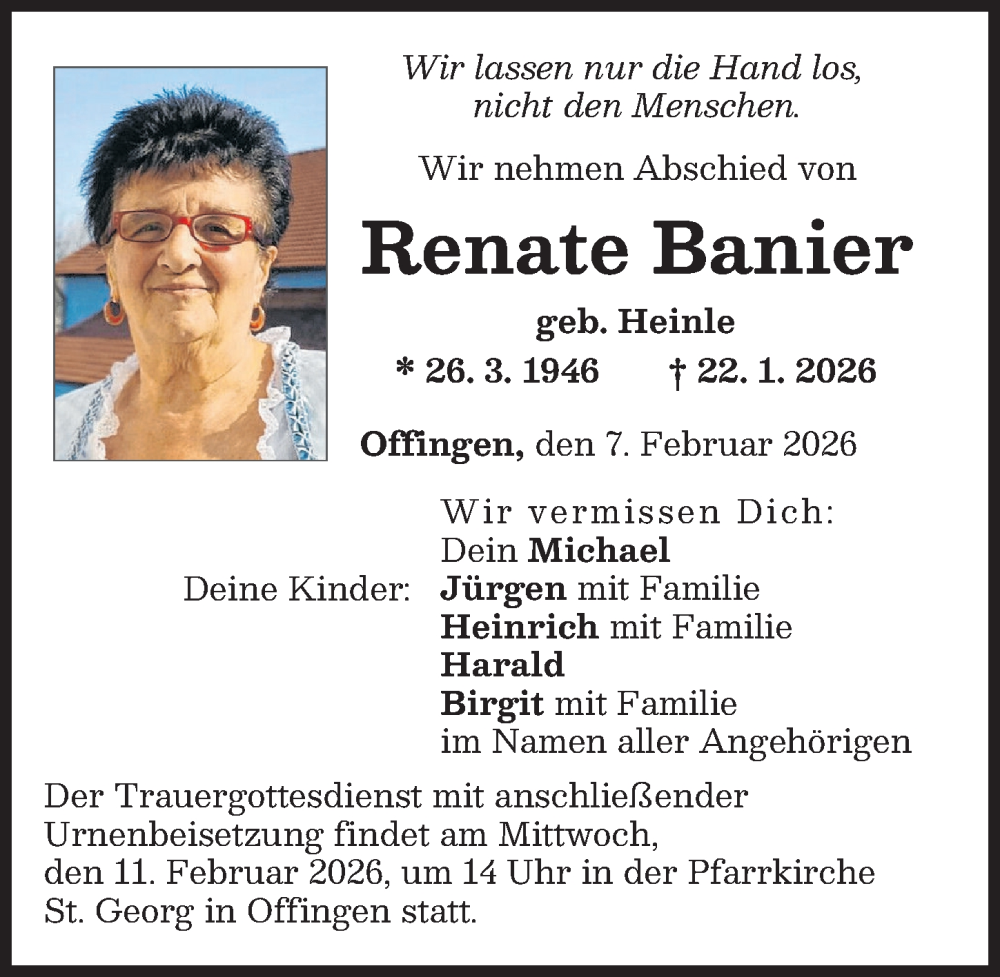 Hier finden Sie alle Traueranzeigen aus der Zeitung, die bisher für Renate Banier erschienen sind. Weitere Traueranzeigen, die in der Zeitung erscheinen, werden hier ebenfalls aufgelistet