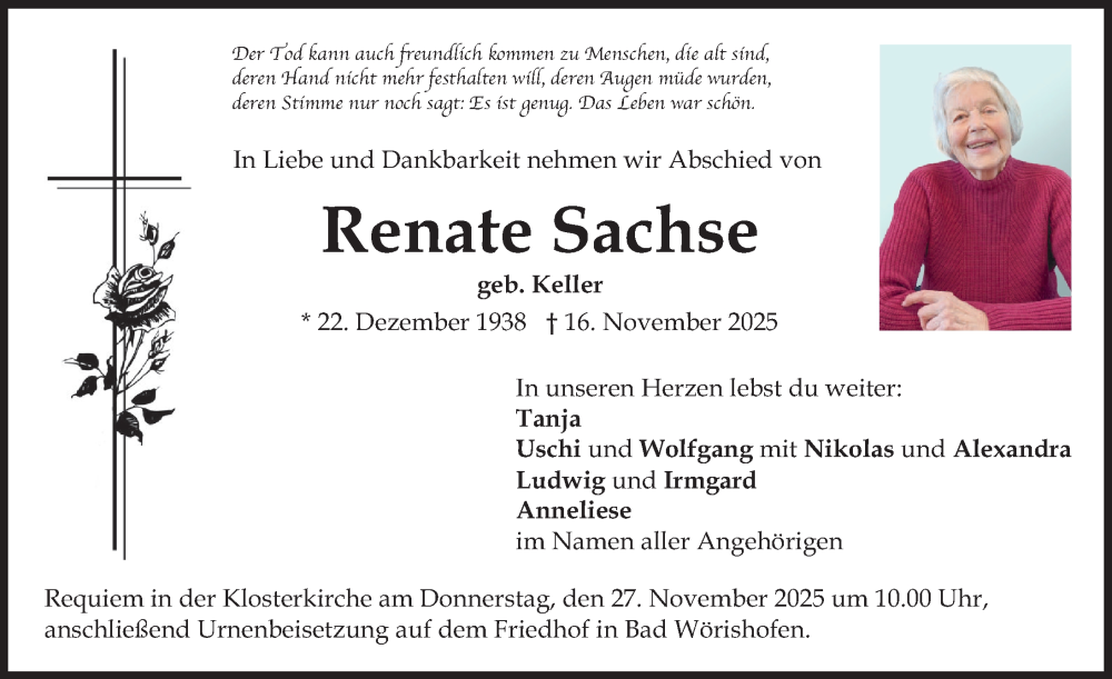 Hier finden Sie alle Traueranzeigen aus der Zeitung, die bisher für Renate Sachse erschienen sind. Weitere Traueranzeigen, die in der Zeitung erscheinen, werden hier ebenfalls aufgelistet