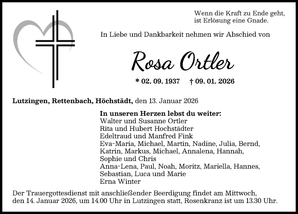 Hier finden Sie alle Traueranzeigen aus der Zeitung, die bisher für Rosa Ortler erschienen sind. Weitere Traueranzeigen, die in der Zeitung erscheinen, werden hier ebenfalls aufgelistet