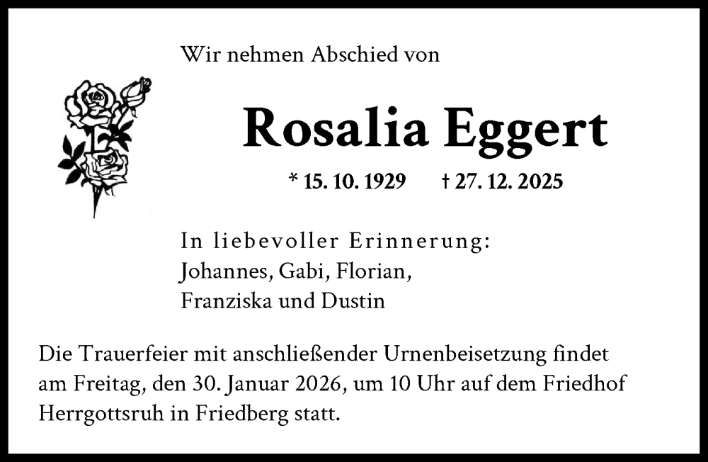 Hier finden Sie alle Traueranzeigen aus der Zeitung, die bisher für Rosalia Eggert erschienen sind. Weitere Traueranzeigen, die in der Zeitung erscheinen, werden hier ebenfalls aufgelistet