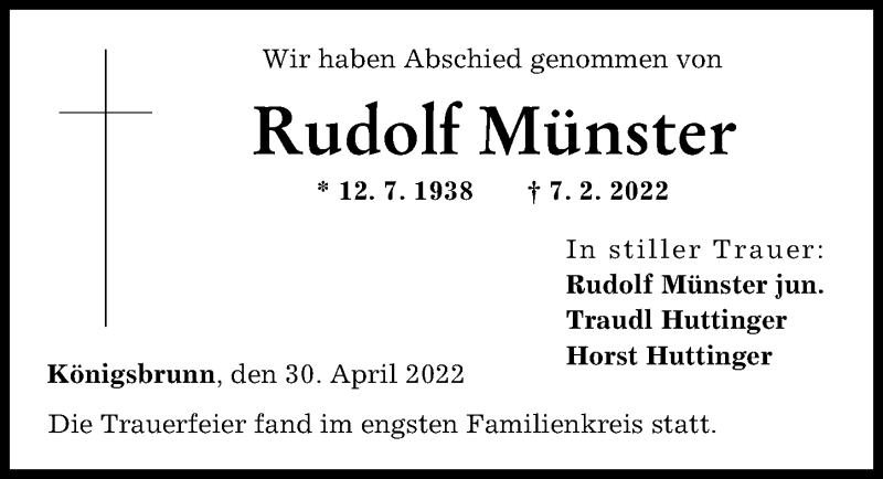 Hier finden Sie alle Traueranzeigen aus der Zeitung, die bisher für Rudolf Münster erschienen sind. Weitere Traueranzeigen, die in der Zeitung erscheinen, werden hier ebenfalls aufgelistet
