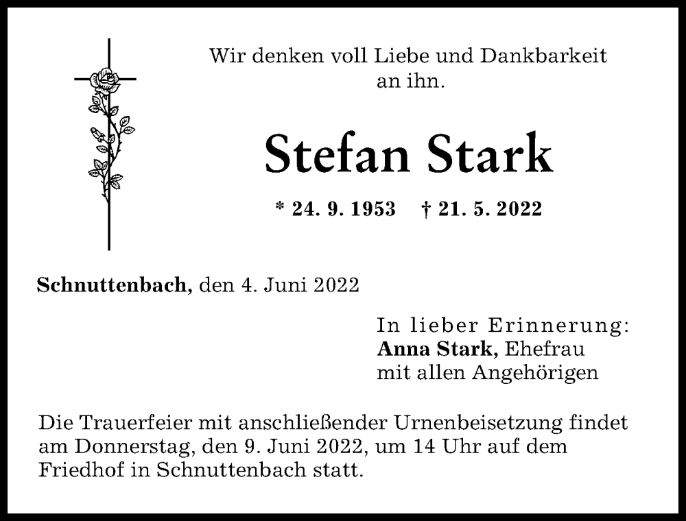 Hier finden Sie alle Traueranzeigen aus der Zeitung, die bisher für Stefan Stark erschienen sind. Weitere Traueranzeigen, die in der Zeitung erscheinen, werden hier ebenfalls aufgelistet