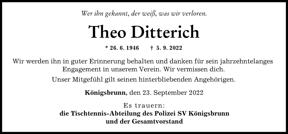 Hier finden Sie alle Traueranzeigen aus der Zeitung, die bisher für Theo Ditterich erschienen sind. Weitere Traueranzeigen, die in der Zeitung erscheinen, werden hier ebenfalls aufgelistet