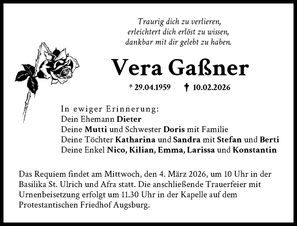 Hier finden Sie alle Traueranzeigen aus der Zeitung, die bisher für Vera Gaßner erschienen sind. Weitere Traueranzeigen, die in der Zeitung erscheinen, werden hier ebenfalls aufgelistet