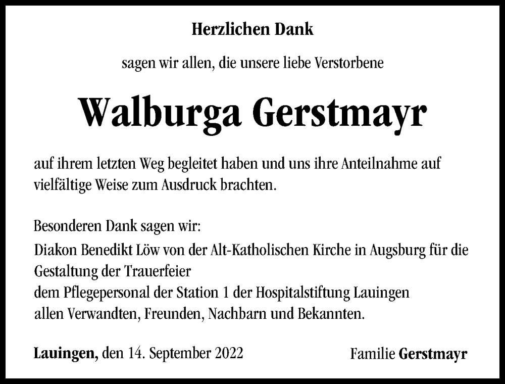 Hier finden Sie alle Traueranzeigen aus der Zeitung, die bisher für Walburga Gerstmayr erschienen sind. Weitere Traueranzeigen, die in der Zeitung erscheinen, werden hier ebenfalls aufgelistet