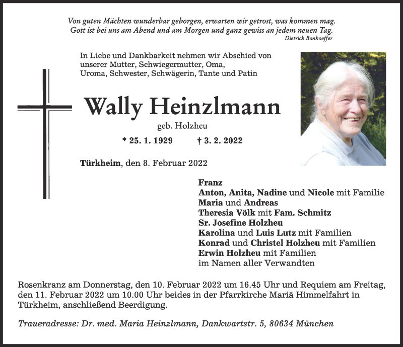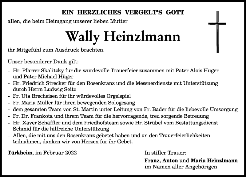 Hier finden Sie alle Traueranzeigen aus der Zeitung, die bisher für Wally Heinzlmann erschienen sind. Weitere Traueranzeigen, die in der Zeitung erscheinen, werden hier ebenfalls aufgelistet