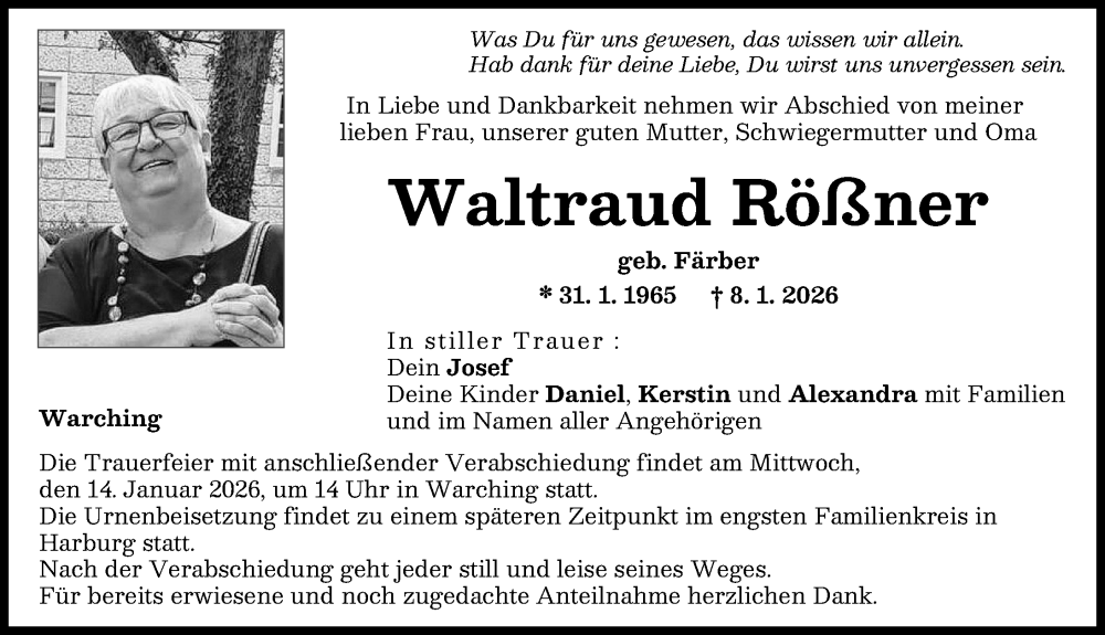Hier finden Sie alle Traueranzeigen aus der Zeitung, die bisher für Waltraud Rößner erschienen sind. Weitere Traueranzeigen, die in der Zeitung erscheinen, werden hier ebenfalls aufgelistet