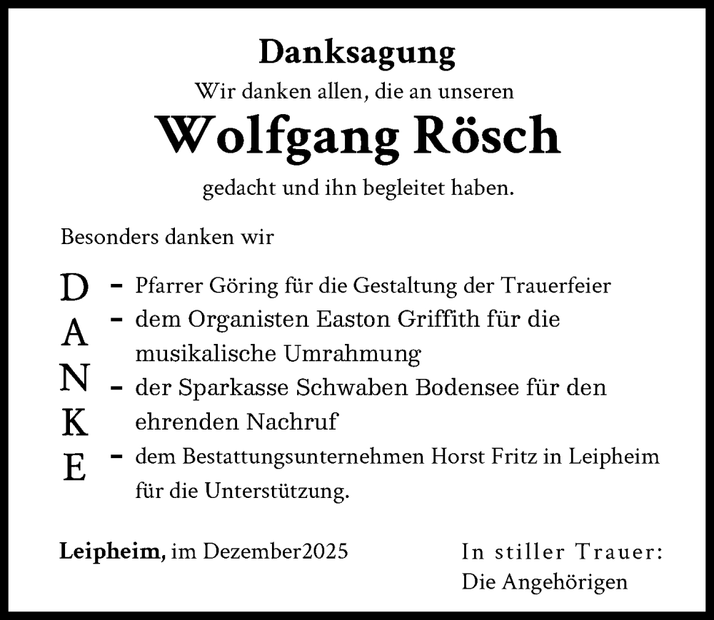 Hier finden Sie alle Traueranzeigen aus der Zeitung, die bisher für Wolfgang Rösch erschienen sind. Weitere Traueranzeigen, die in der Zeitung erscheinen, werden hier ebenfalls aufgelistet